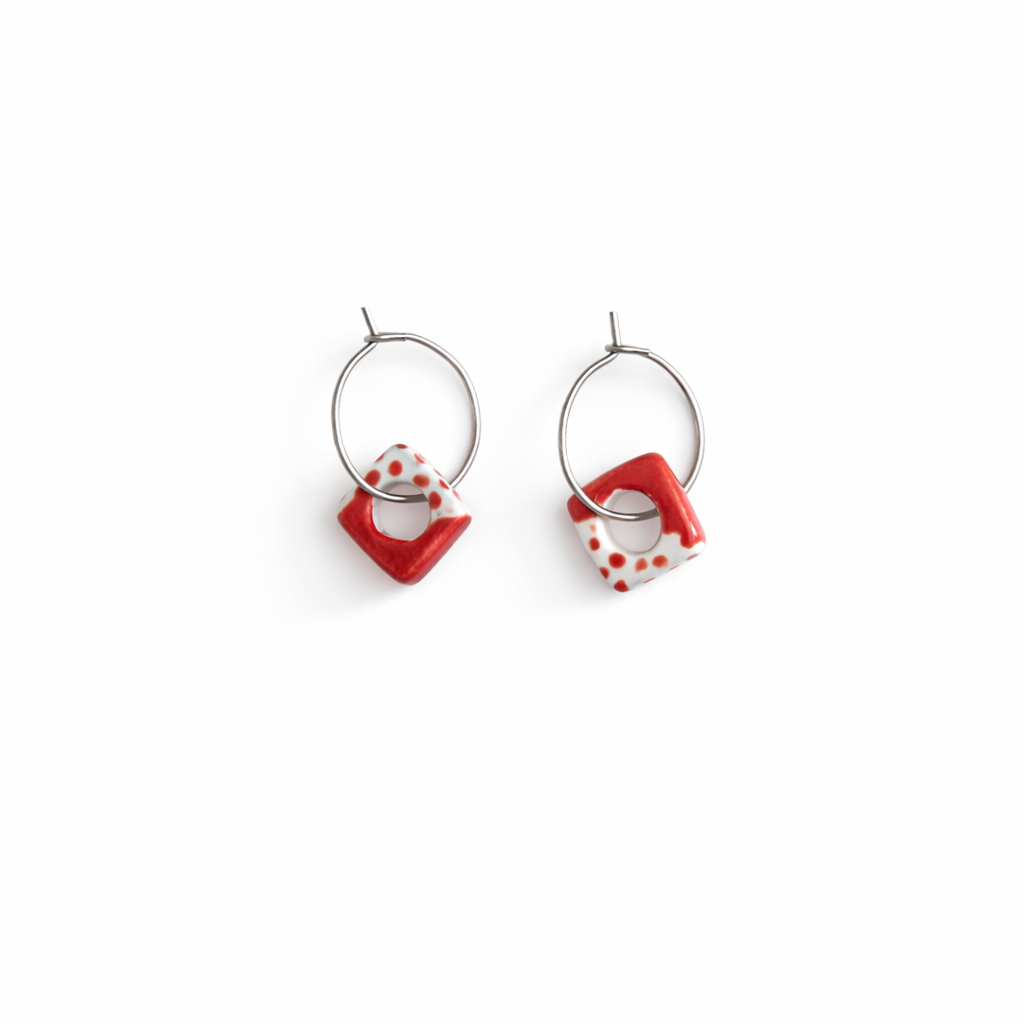 Orecchini dal design giocoso e contemporaneo, arricchiti da piccoli elementi in ceramica fatti a mano. Le forme geometriche smaltate combinano il rosso brillante con il bianco decorato da pois irregolari, creando un contrasto vivace e originale.