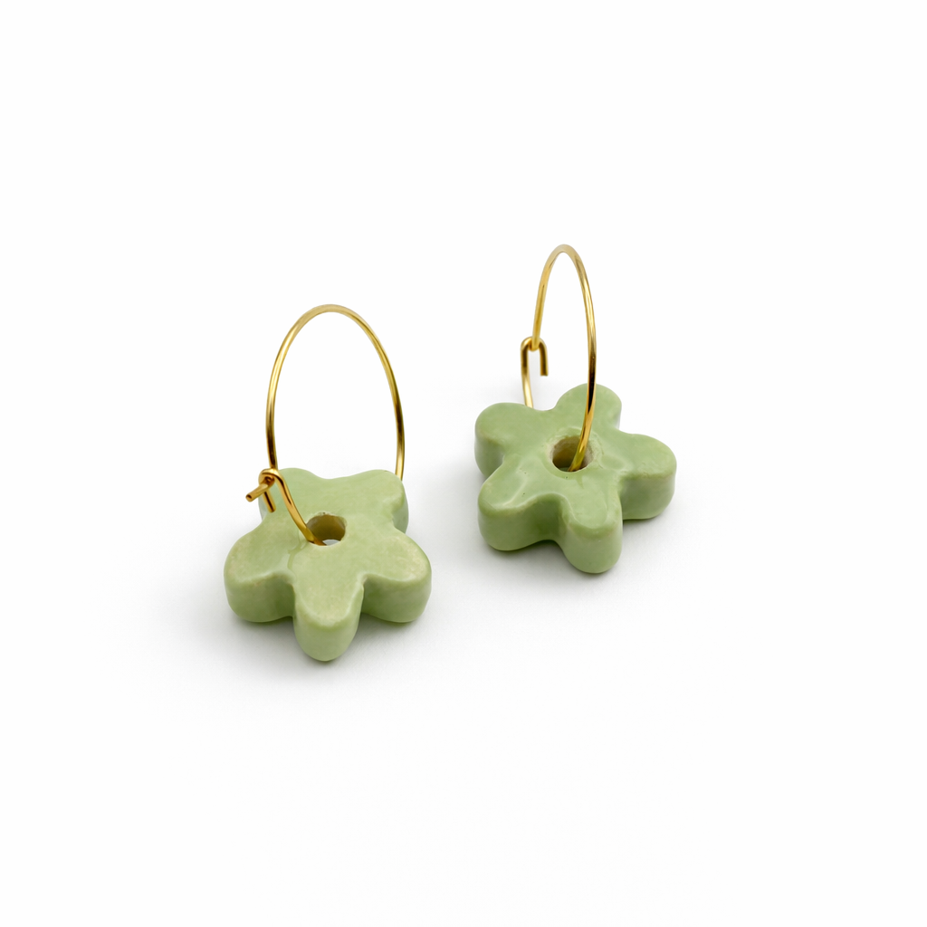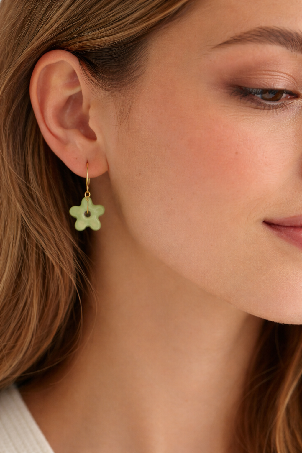 Orecchini pendenti con delicato ciondolo a forma di fiore realizzato in ceramica e smaltato in una morbida tonalità verde. Il design semplice e naturale li rende perfetti per un look fresco, elegante e quotidiano.