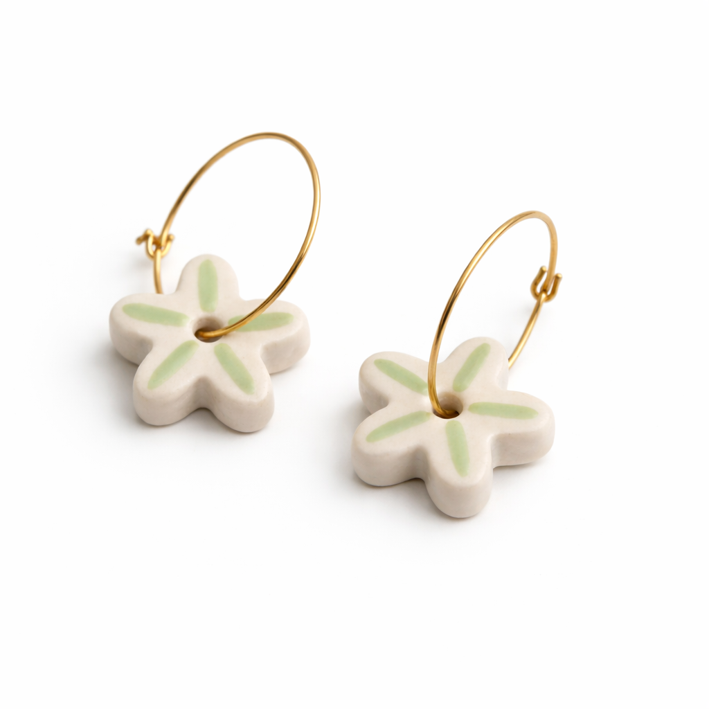 Delicati orecchini pendenti con piccolo fiore in ceramica modellato e dipinto a mano. Il design minimal con dettagli verde chiaro rende questi orecchini leggeri, eleganti e perfetti per l’uso quotidiano.