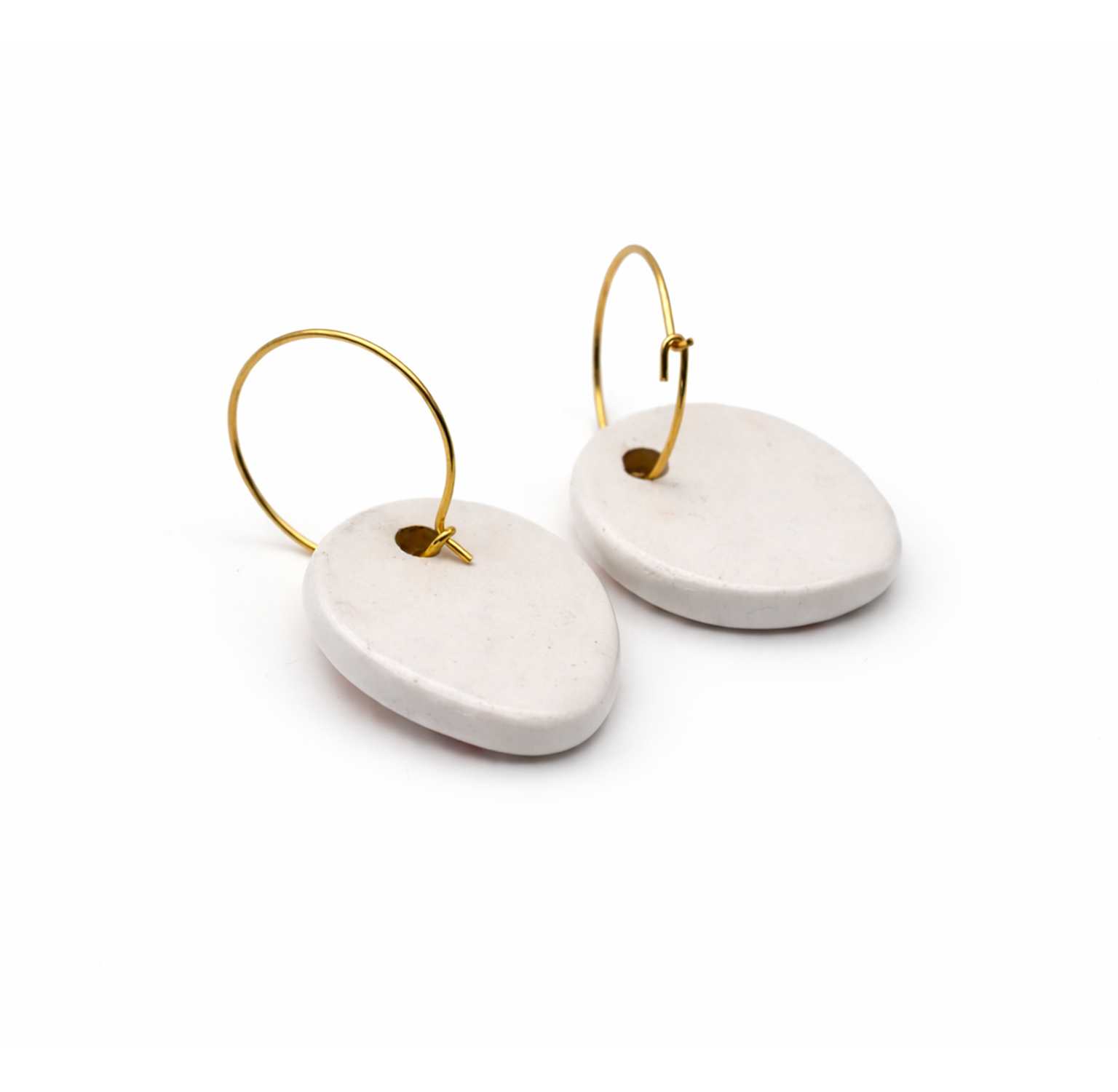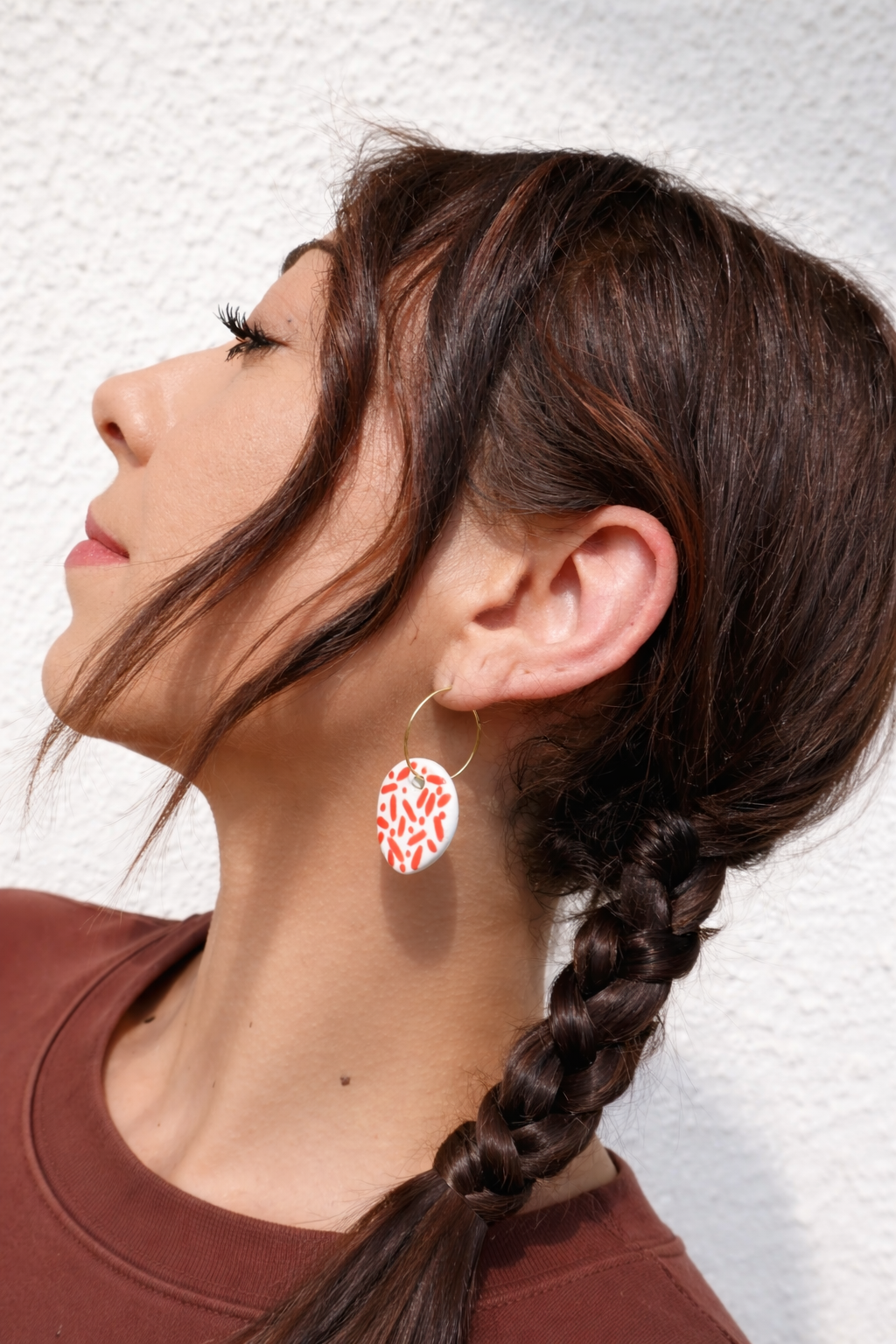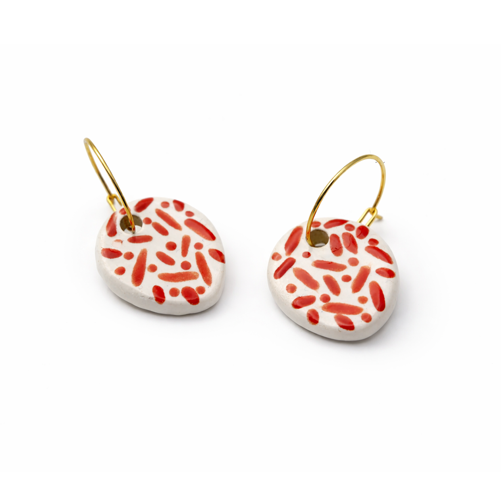 Orecchini artigianali in ceramica caratterizzati da una base bianco caldo decorata con un vivace motivo rosso ispirato alle forme organiche del corallo. Il contrasto tra il bianco della ceramica e il rosso intenso crea un effetto grafico moderno e luminoso.