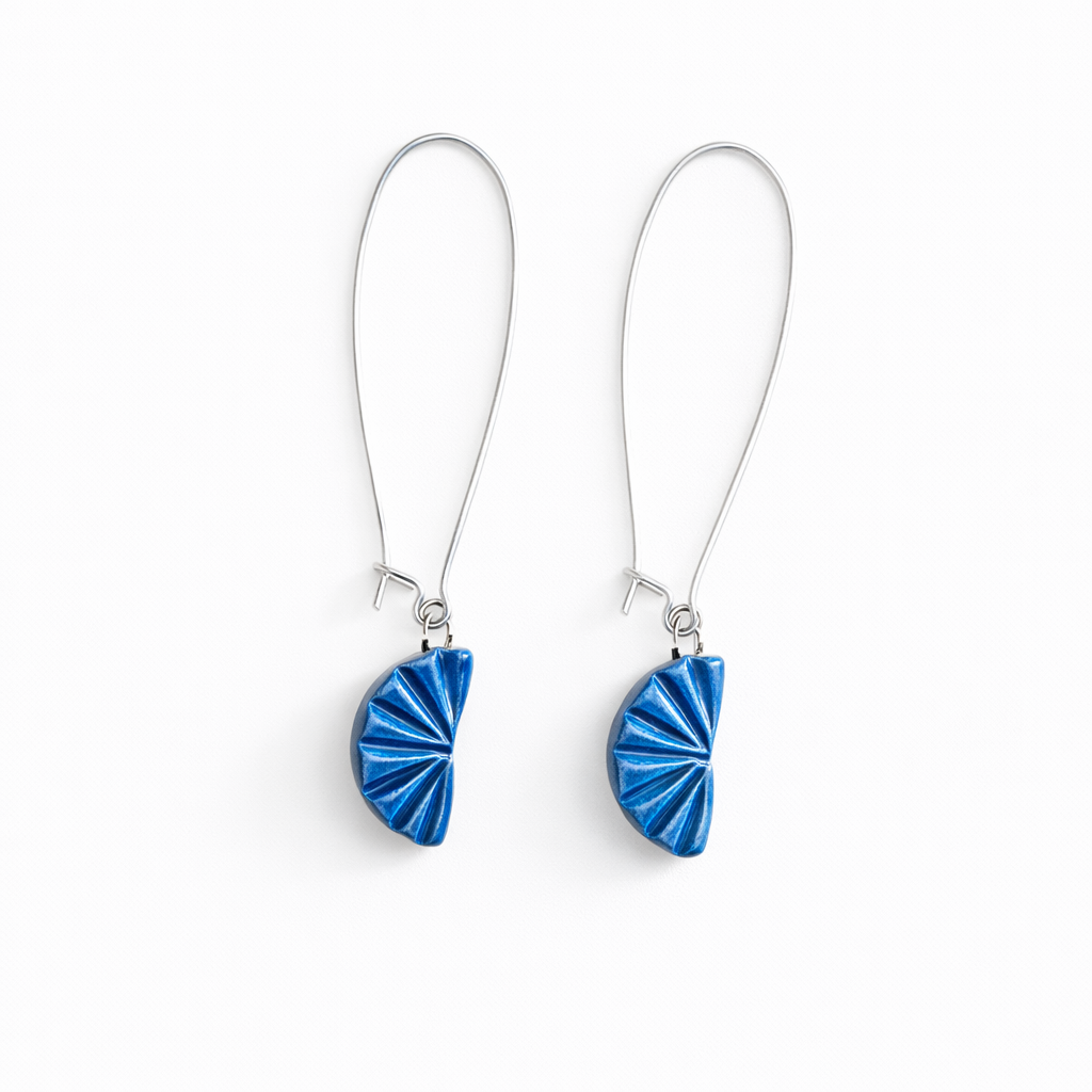 Pendenti artigianali in ceramica smaltata dal design elegante e contemporaneo. La forma a ventaglio, lavorata a mano con sottili incisioni radiali, crea un raffinato gioco di luce sulla superficie smaltata in un intenso blu luminoso.